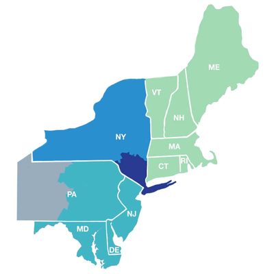 Connecticut, Delaware, Maine, Maryland, Massachusetts, New Hampshire, New Jersey, New York, Eastern Pennsylvania, Rhode Island, Vermont